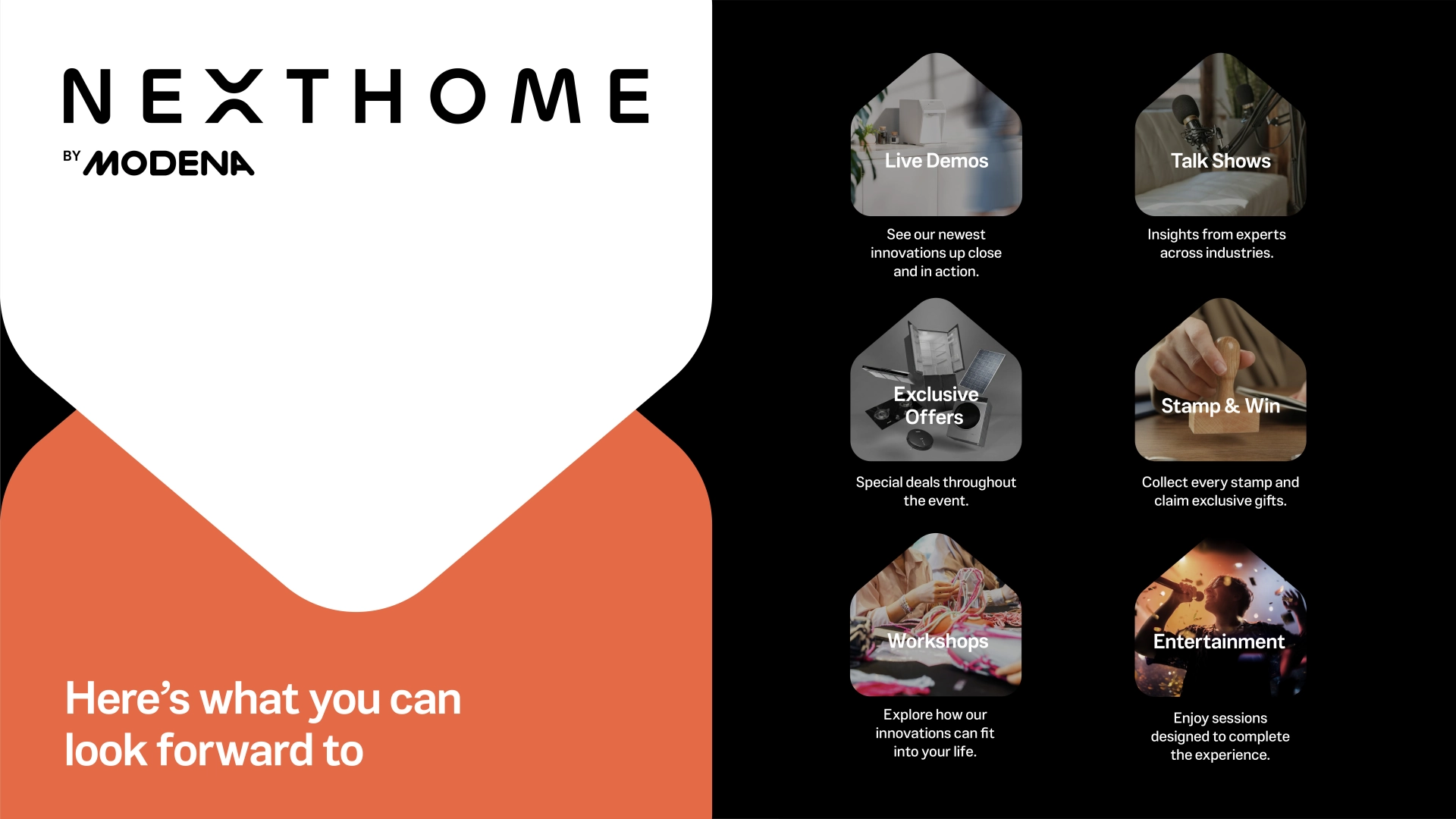 Dalam NEXTHOME by MODENA, pengunjung akan diajak membayangkan dan merancang rumah impian mereka melalui rangkaian inovasi terpadu MODENA. Konsep smarter everyday living akan diwujudkan dalam sebuah instalasi besar yang memadukan ekosistem produk pintar, instalasi seni interaktif, serta berbagai aktivitas edukatif. Selama empat hari, masyarakat dapat mengeksplorasi bagaimana teknologi mampu menciptakan rumah yang lebih intuitif, efisien, dan personal.