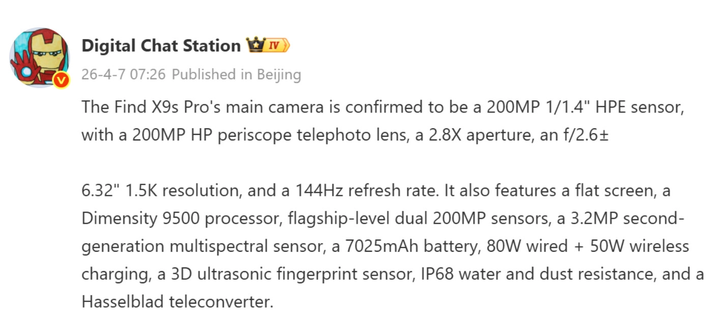 “Find X9s Pro akan memiliki kamera utama 200MP berbasis sensor HPE 1/1.4 inci,” tulis DCS.