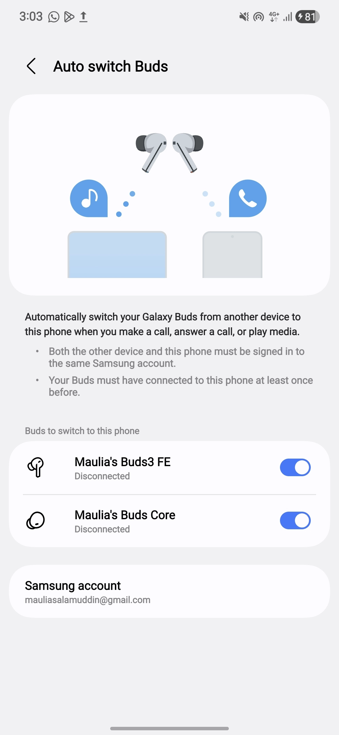 Samsung Galaxy Buds3 FE tidak dibekali Bluetooth Multipoint, fitur yang memungkinkan koneksi bersamaan ke dua perangkat. Sebagai gantinya, Samsung menawarkan Auto-Switch yang mulus antar perangkat Samsung dalam satu ekosistem.